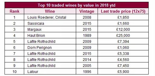 其中,路易王妃水晶香槟(Louis Roederer Cristal)是此次交易额最高的酒款。然而这款20%8年的酒在今年5月才正式发布,但很快就成为交易额最高的酒款。另外,十款酒中有7款都是来自法国波尔多产区。